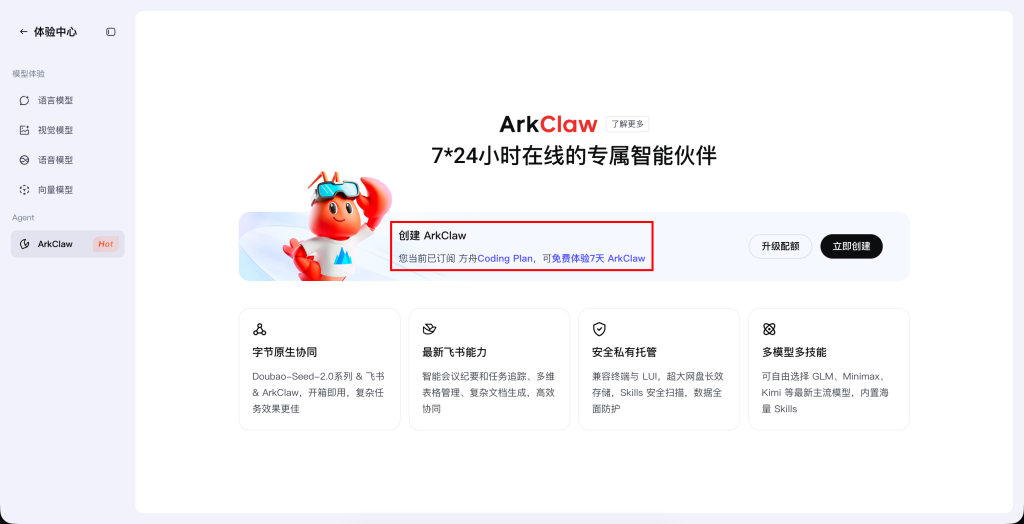 顺便提一下 ArkClaw。开通 Lite Plan 后即可直接使用,相比火山引擎一键部署更加偏向产品化。