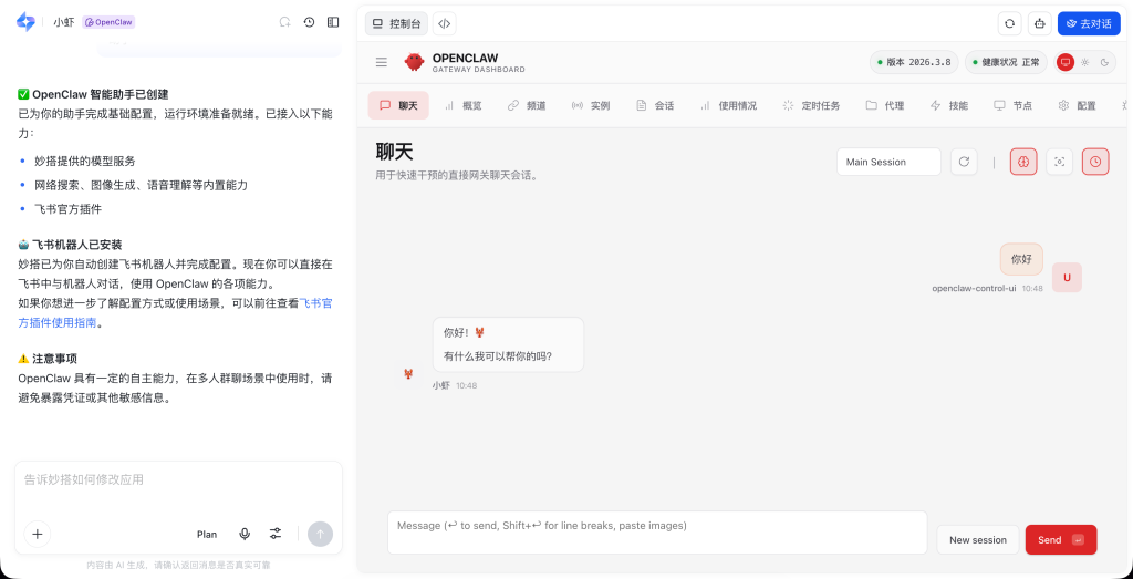 真正意义上的一键搭建。后端运行在飞书妙搭中,并自动对接飞书会话,是目前体验 OpenClaw 最简单的方式之一。