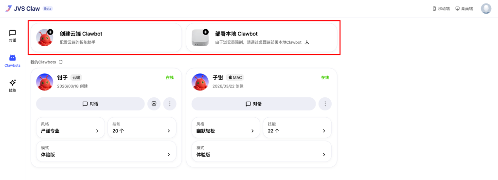 JVS Claw 支持本地和云端两种部署模式,客户端有 Web 端、桌面端和移动端,三端齐全,完成度非常高。
