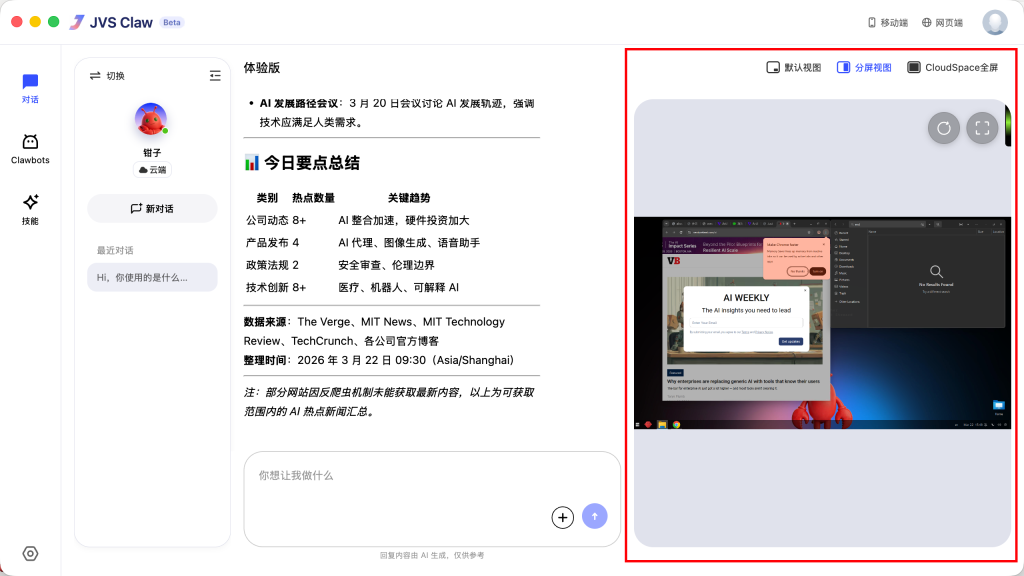 JVS Claw 的思路是目前我最认可的方案:本地负责入口 / 云端负责算力、本地负责轻操作 / 云端负责重操作。在当前阶段,纯本地不现实,纯云端不好用,云 + 本地协同是最可落地也是最舒服的体验形态。但目前云端和本地的内容还没有打通,比如同步Skills、互传文件等,期待可以早日推进。